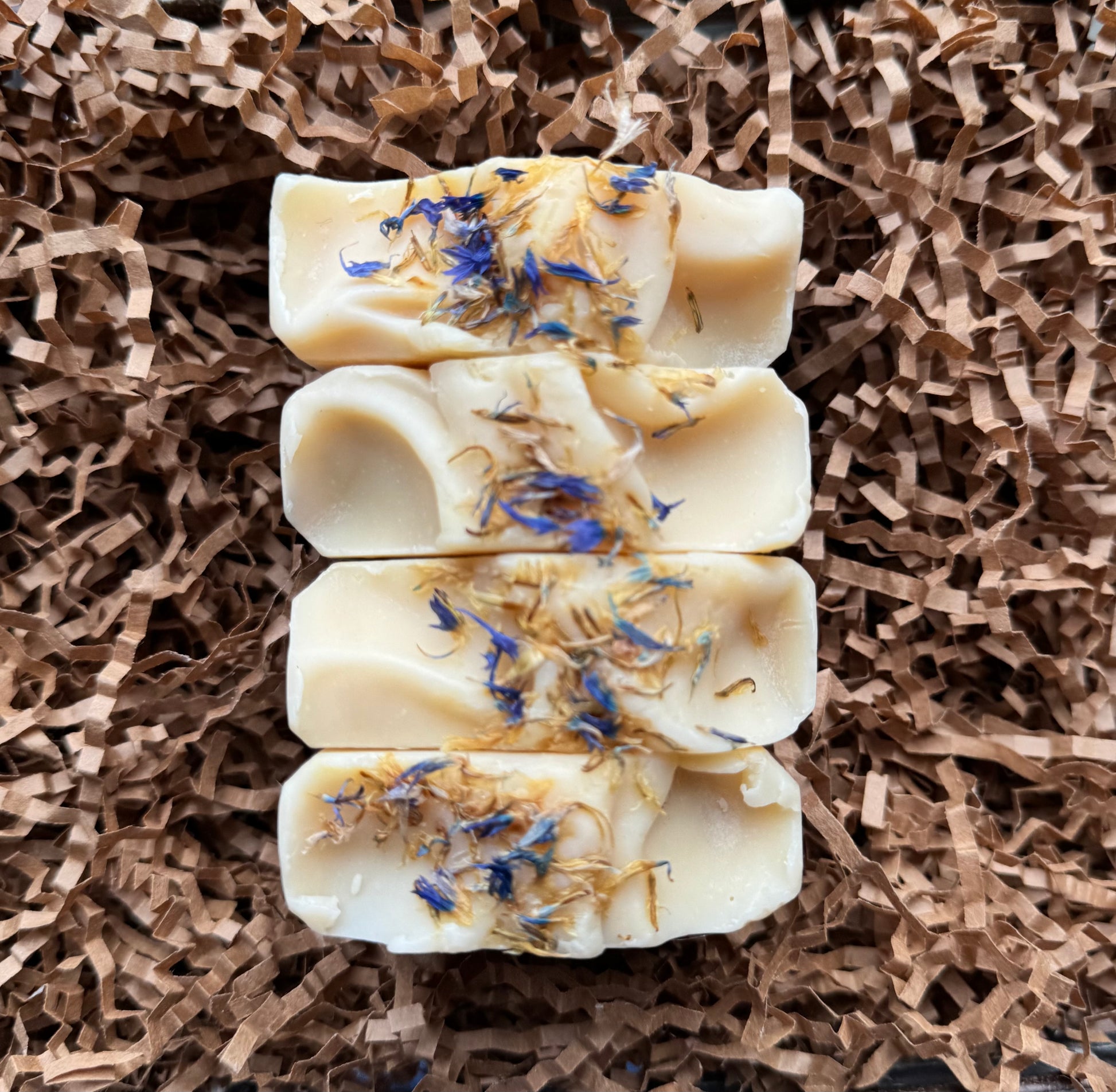 Ingredients: Olive Oil, Coconut Oil, Shea Butter, Coconut Milk, Distilled Water, Sodium Hydroxide, Cocoa Butter, Avocado Oil, Castor Oil, Jojoba Oil, Fragrance Oil, and Indigo Powder.